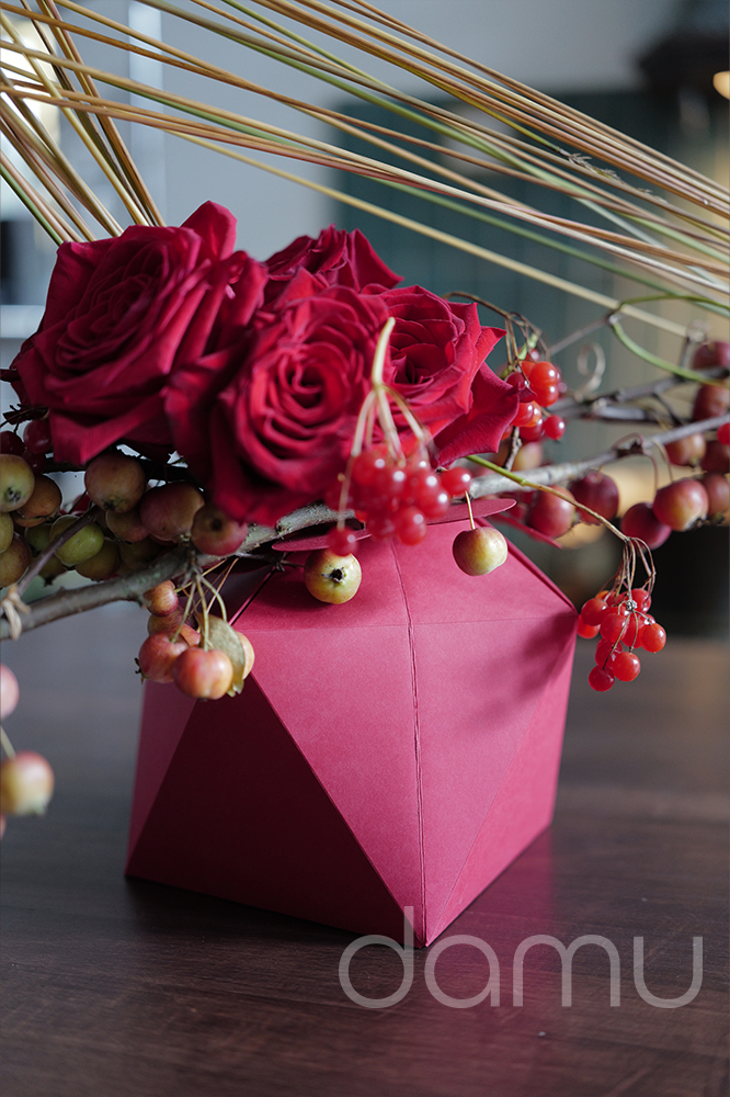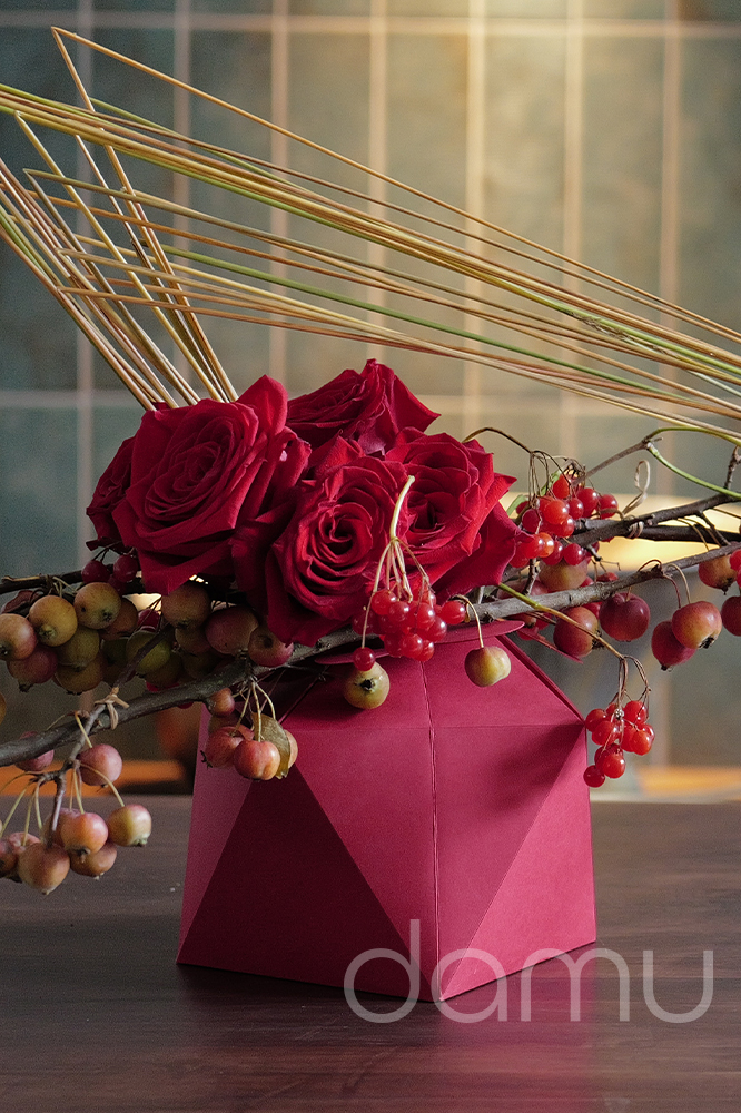 Dans cette création contemporaine aux nuances rouges, Gaétan Jacquet met en valeur la boîte Cristal de chez Polypap, un contenant aussi esthétique que pratique. Souvent perçue comme une simple réserve d’eau, la boîte Cristal révèle ici tout son potentiel créatif : économique, modulable et disponible en plusieurs coloris, elle s’adapte à toutes les occasions – fêtes de fin d’année, Saint-Valentin, abonnements professionnels et bien plus encore.